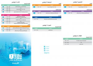 يضم برنامج منتدى شباب العالم مجموعة متنوعة من المحاور التي تناقش قضايا وموضوعات تهم مختلف الفئات الشبابية حول العالم، والتي من خلال جلساتها سيعبر شباب العالم عن رؤاهم ويطرحوا أفكارهم ويتبادلوا تجاربهم.
