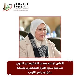 يهنئ المجلس الأعلى لتنظيم الإعلام، برئاسة المهندس خالد عبدالعزيز، السيدة الدكتورة/ ثريا البدوي، عميد كلية الإعلام جامعة القاهرة وعضو لجنة تطوير الإعلام المصري، بمناسبة صدور القرار الجمهوري بتعينها عضوًا بمجلس النواب.