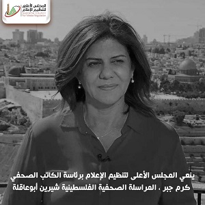 ينعي المجلس الأعلى لتنظيم الإعلام برئاسة الكاتب الصحفي كرم جبر ، المراسلة الصحفية الفلسطينية شيرين أبوعاقلة، التي استشهدت برصاص قوات الاحتلال خلال عدوانه على جنين.