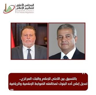 بناءً على التواصل الذي تم بين المجلس الأعلى لتنظيم الإعلام برئاسة المهندس خالد عبدالعزيز، والبنك المركزي برئاسة السيد/ حسن عبدالله، بشأن ما تم رصده من مخالفات في محتوى إعلان لأحد البنوك، تم تعديل الإعلان على الفور على جميع صفحات التواصل الاجتماعي.