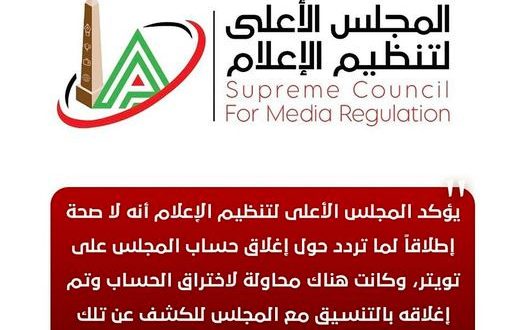 يؤكد المجلس الأعلى لتنظيم الإعلام أنه لا صحة إطلاقاً لما تردد حول إغلاق حساب المجلس على تويتر، وكانت هناك محاولة لاختراق الحساب وتم إغلاقه بالتنسيق مع المجلس للكشف عن تلك المحاولة والتعامل معها.