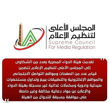 تقدمت هيئة الدواء المصرية بعدد من الشكاوى إلى المجلس الأعلى لتنظيم الإعلام تتضمن قيام عدد من الصفحات ومواقع التواصل الاجتماعي والمواقع الإلكترونية والتطبيقات ببيع وتداول مستحضرات صيدلية وادوية ومكملات غذائية غير مسجلة بهيئة الدواء ،والإعلان عن مواد دعائية مخالفة وغير حاصلة على موافقة مسبقة للتدوال من الهيئة.